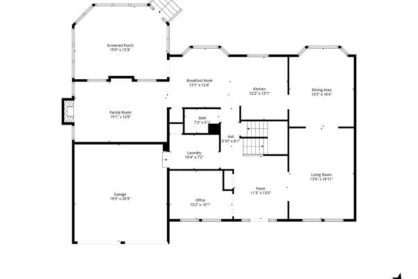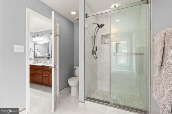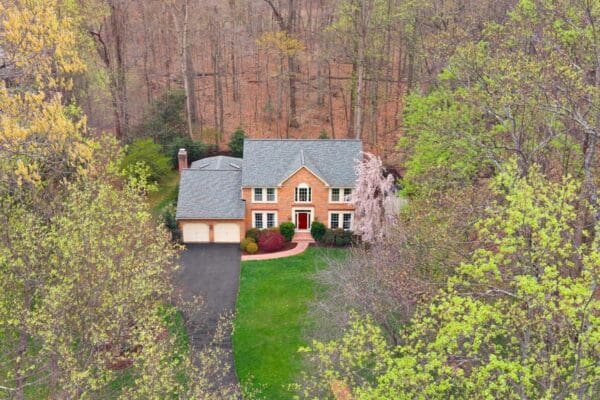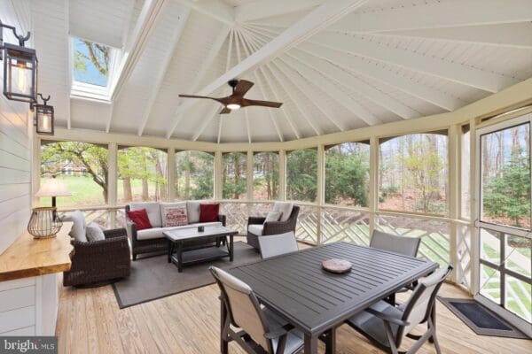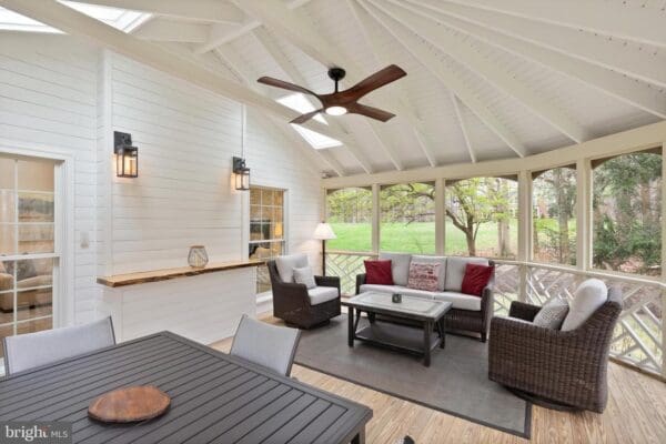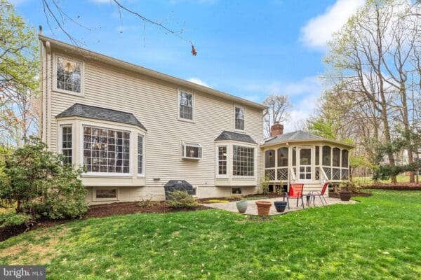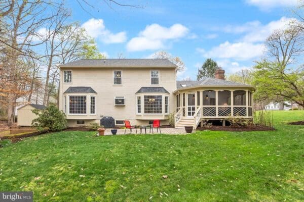 The kitchen features custom natural cherry cabinetry, updated countertops, tile backsplash, double ovens, a pantry cabinet, and an eat-in area with a charming bay window. The cooktop can easily be converted to gas. Just off the breakfast area, the family room offers hardwood floors, skylights, and a white-washed brick fireplace that anchors the space. Step outside to the screened porch, designed for multi-season enjoyment with skylights, a ceiling fan, and a built-in bar, all overlooking the stone patio and private backyard. A powder room and convenient main-level laundry complete this level. Upstairs, the primary suite offers a custom walk-in closet and a beautifully updated bath with marble counters, basket-weave tile shower, and a soaking tub. Three additional bedrooms with carpeting, two linen closets, and an updated hall bath with double sinks and granite counters provide comfortable accommodations.