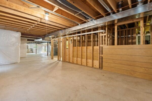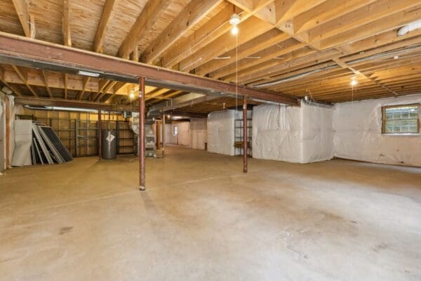 The full basement is an unfinished space with a rough in for a bathroom, egress windows, French doors with walk up stairs to side yard, and two huge storage rooms.