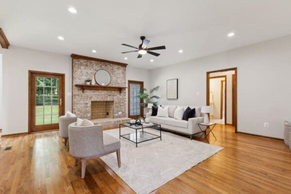 The main level features beautiful living space with an office, formal dining room, large great room with brick hearth wood burning fireplace, kitchen, and the primary bedroom with en-suite bathroom, along with two additional large bedrooms, a hall full bathroom, laundry room and powder room.