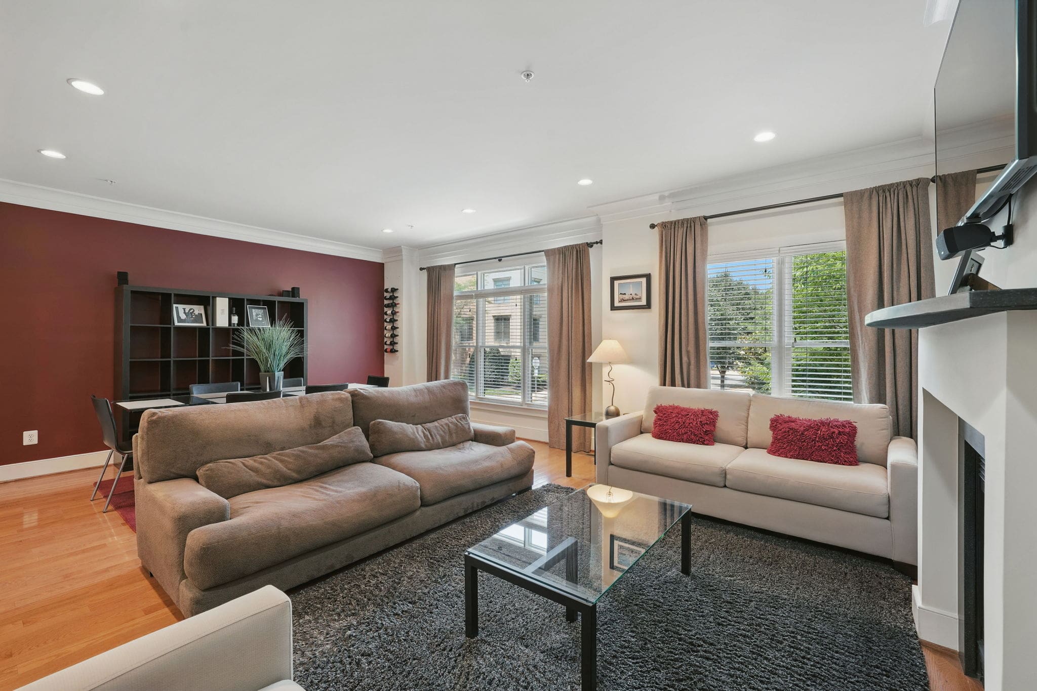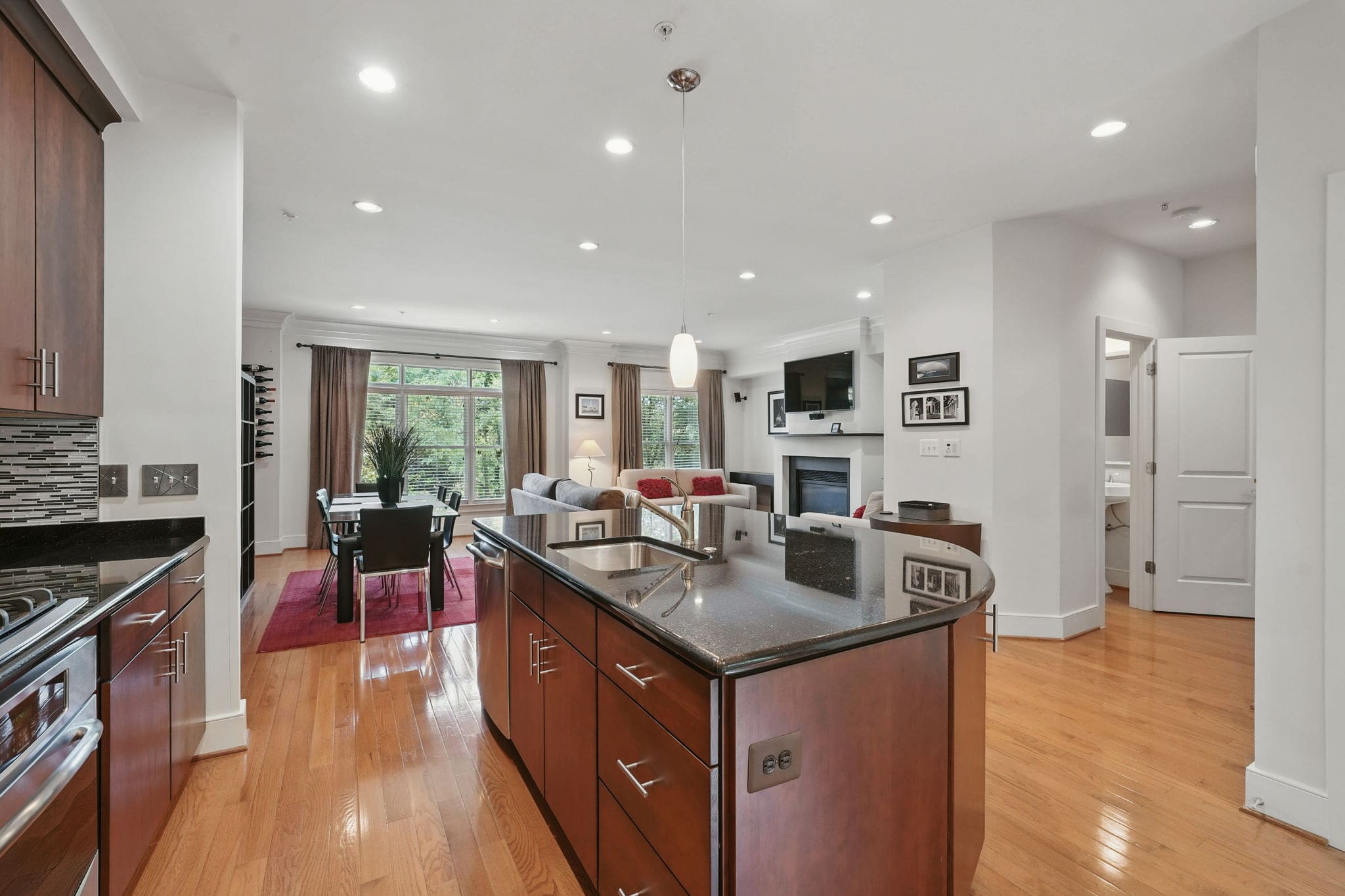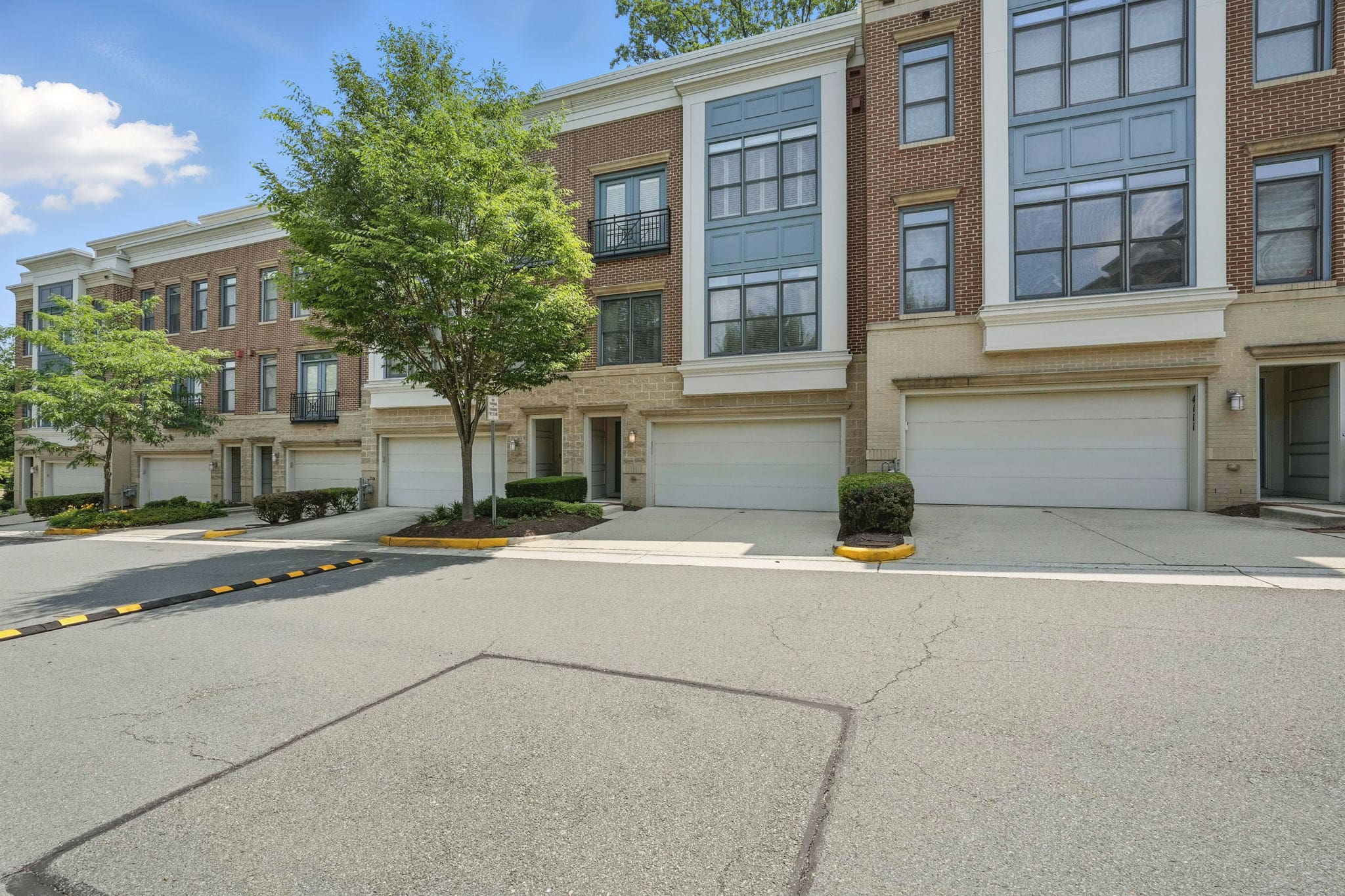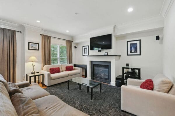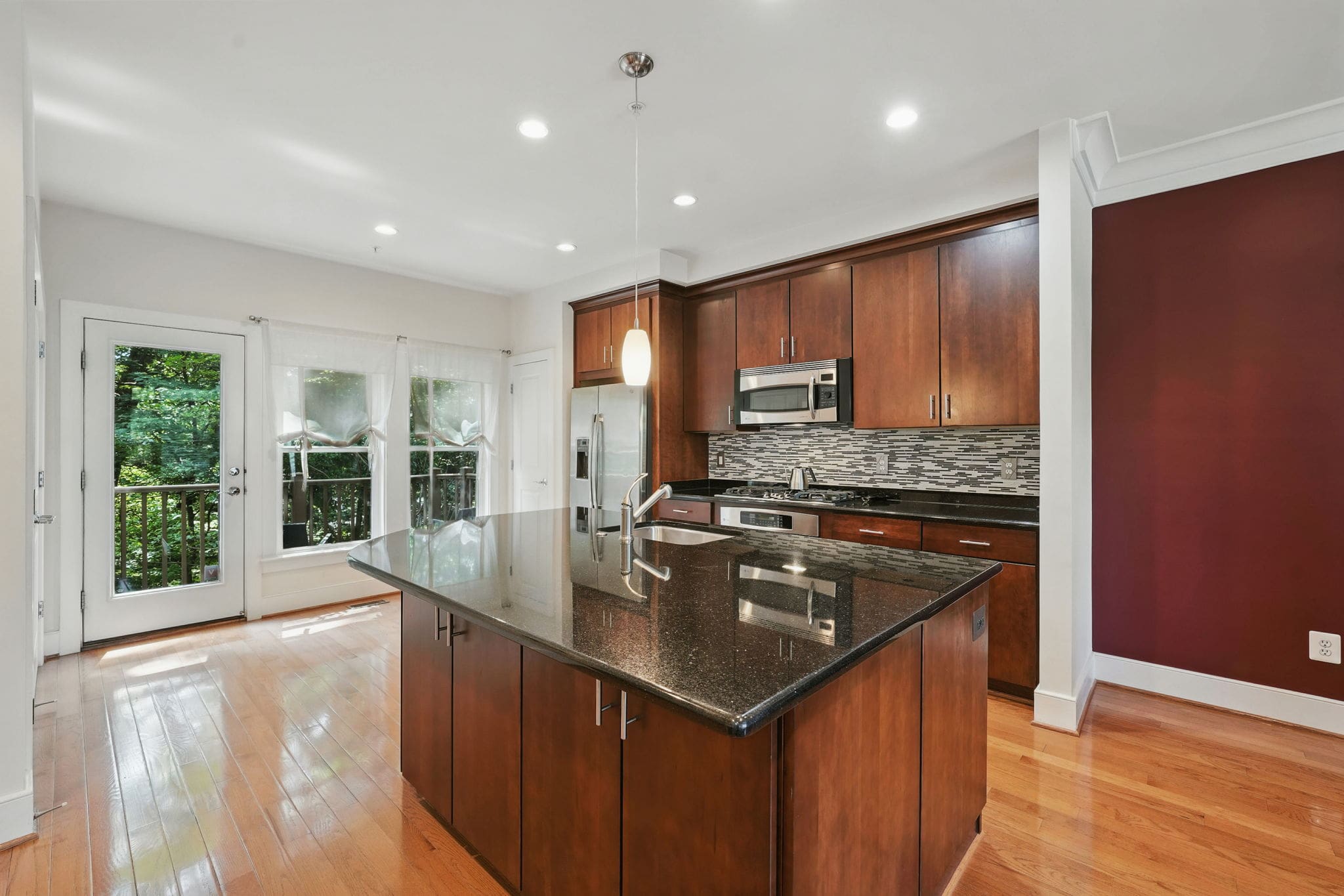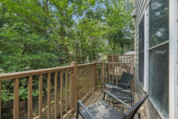 This EYA DePaul model, 3-bedroom, 4-bath townhome stands out among other two-car garage properties with its upgraded finishes, versatile floor plan, and multiple outdoor living spaces. The open main level features hardwood flooring, a spacious kitchen with a massive island, quartz countertops and exquisite backsplash, gas GE Profile range, pantry storage closet, and access to a composite deck overlooking green space—ideal for grilling or relaxing outdoors.