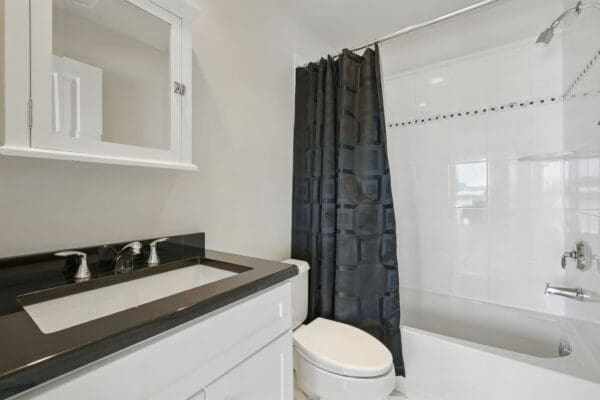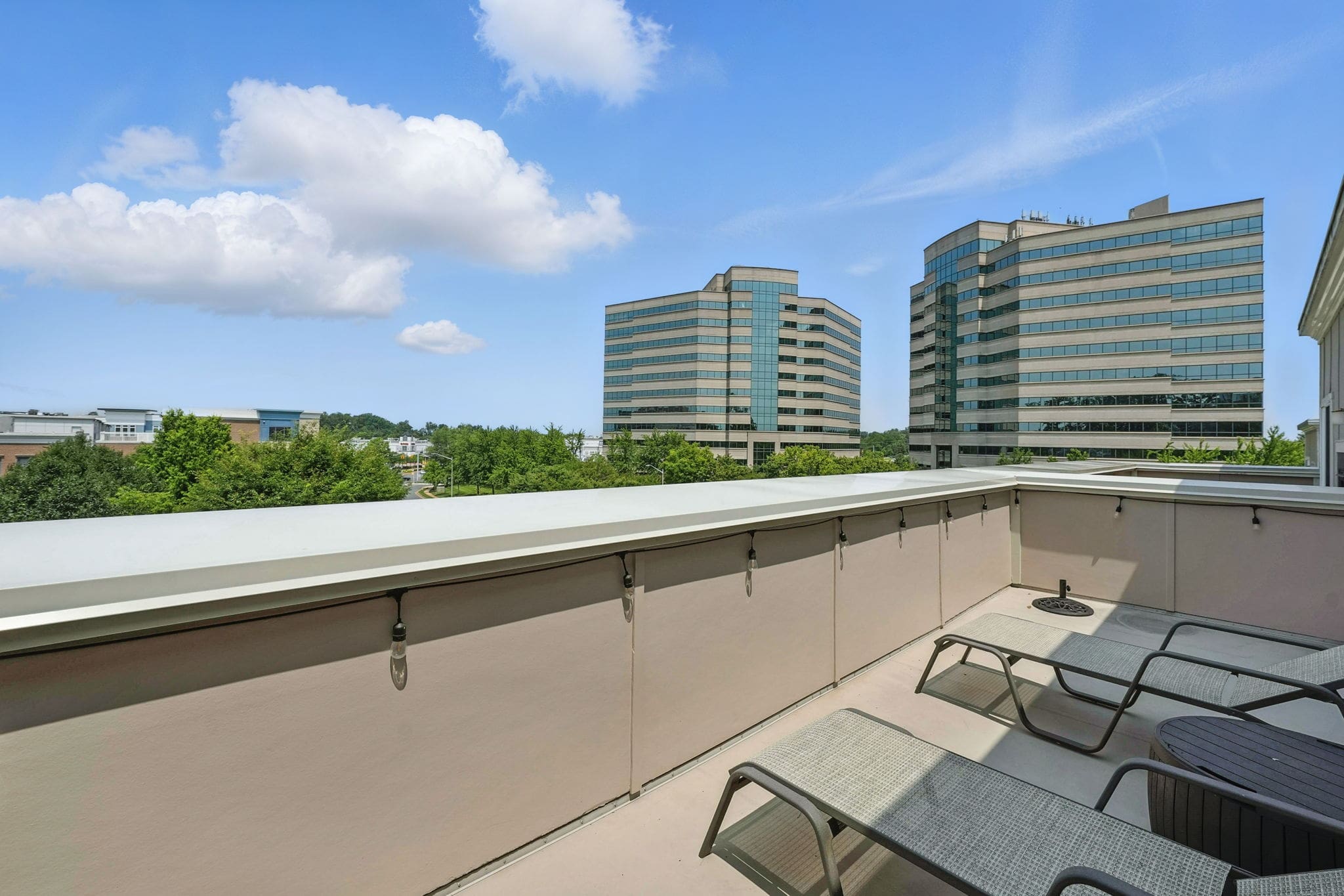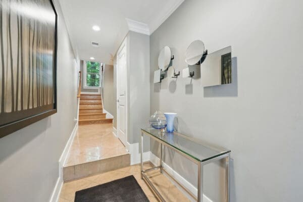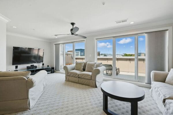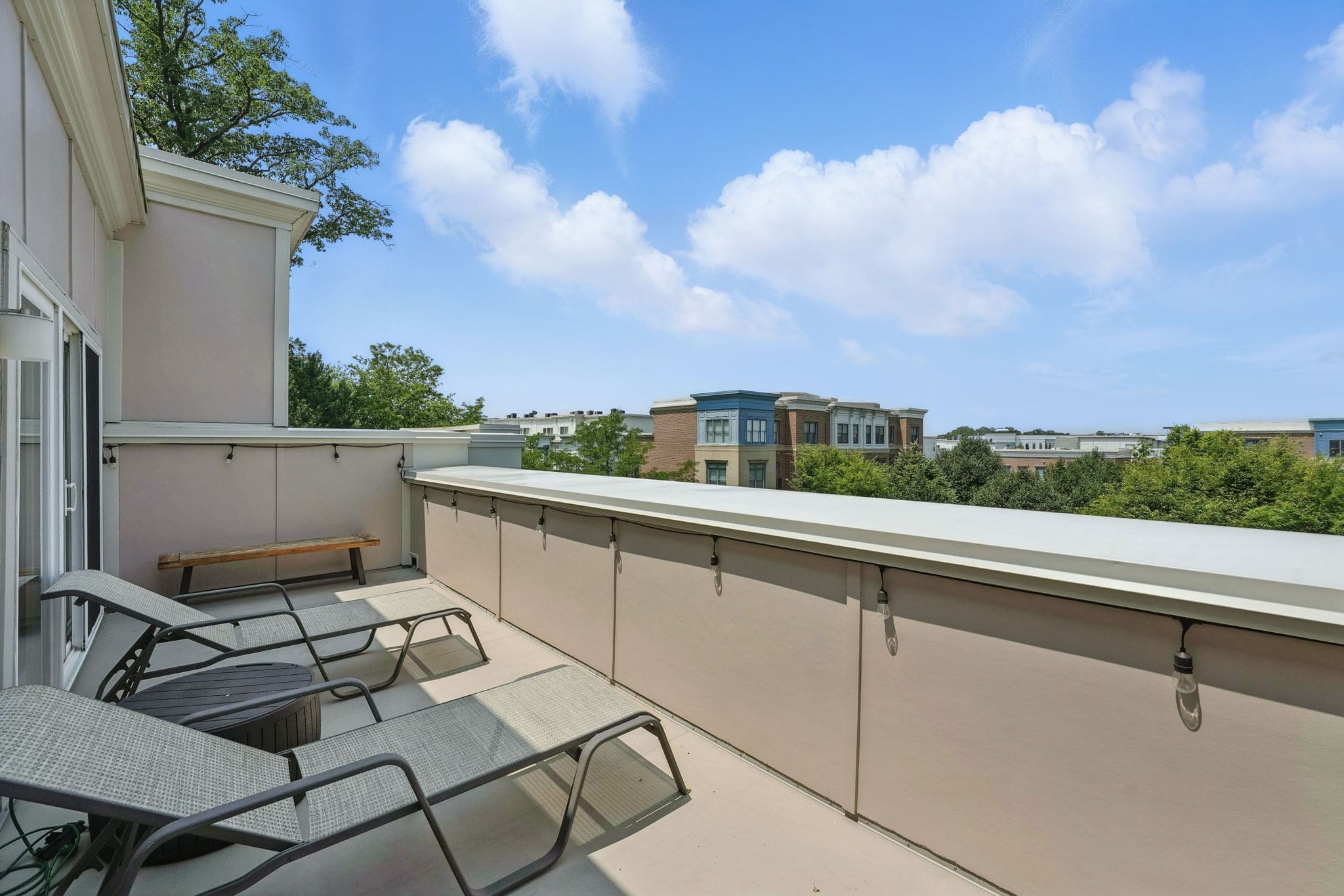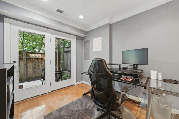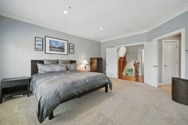 The third-level primary suite includes a Juliet balcony, walk-in and linen closets, and an oversized en-suite bathroom with a jetted tub for two, walk-in shower, dual-sink quartz vanity, and private water closet. A unique upper loft level provides a third bedroom, full bathroom, and private rooftop terrace—making this level a perfect retreat.