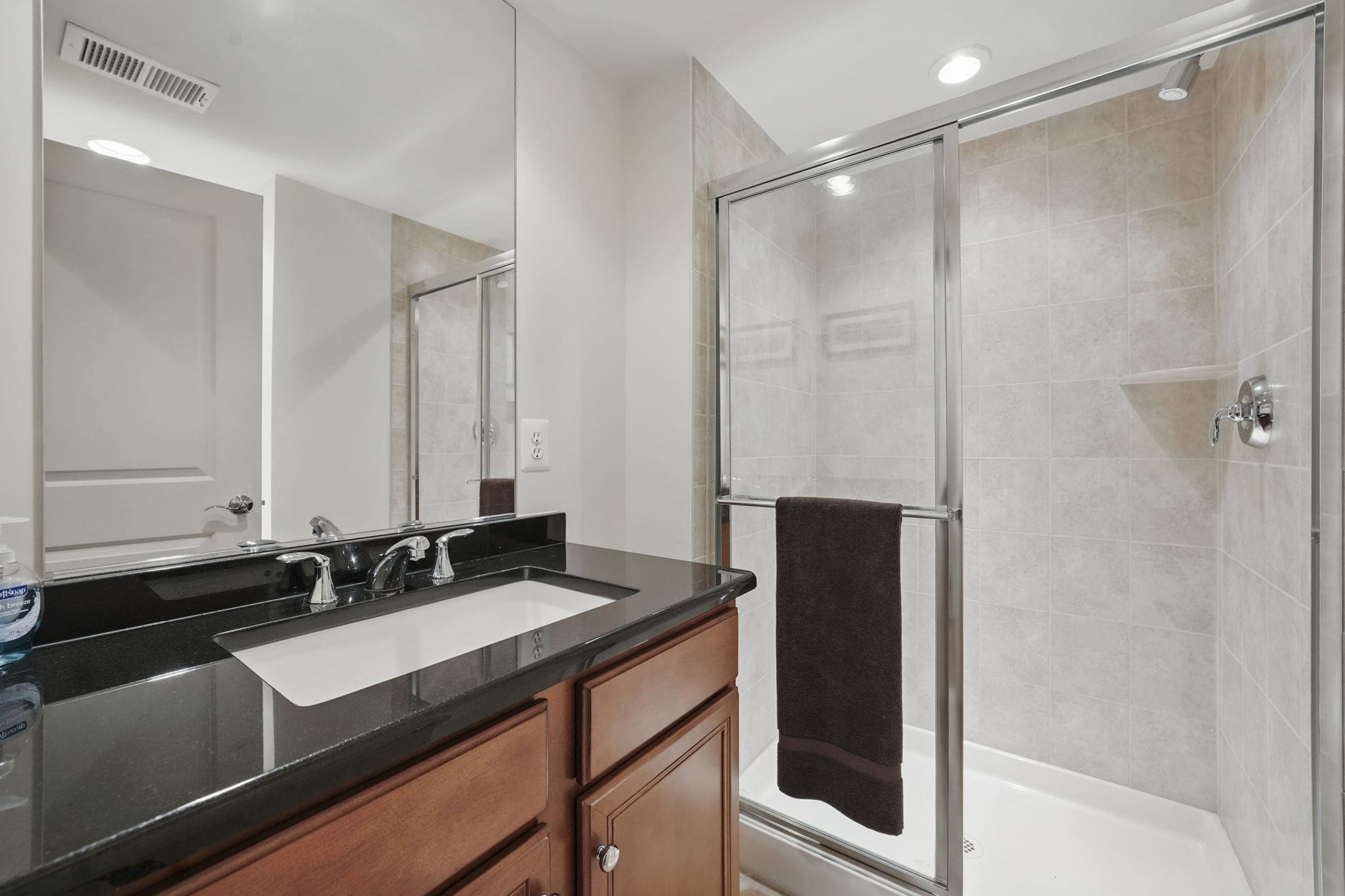 Unlike many standard layouts, this home offers a flexible entry level with travertine tile flooring, a full bathroom, bedroom, and walkout access to a private pressed concrete patio—perfect for guests or home office.