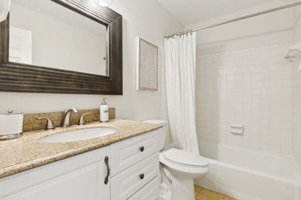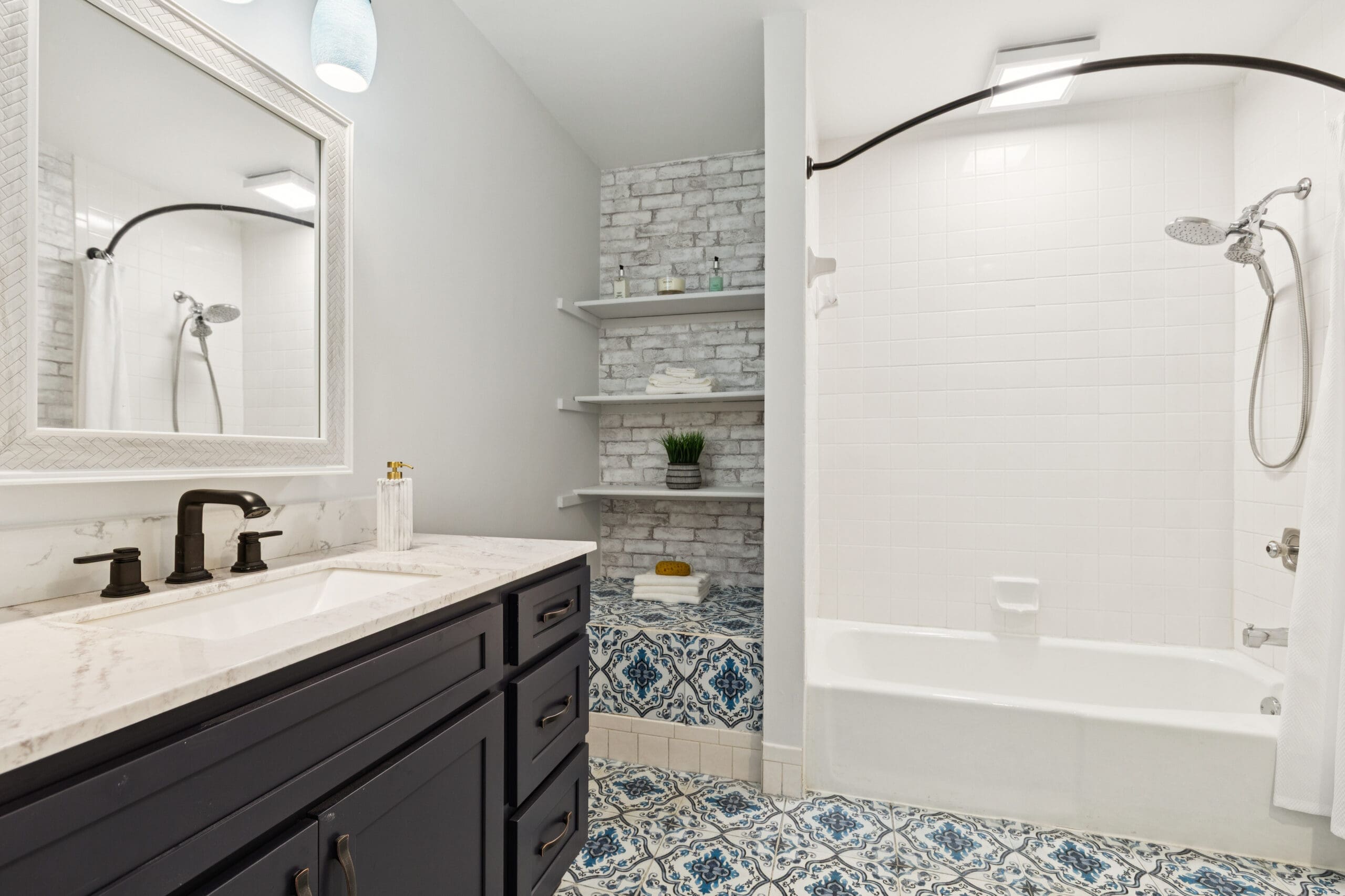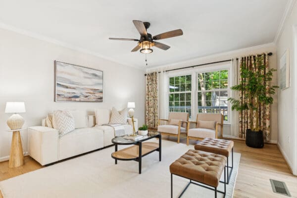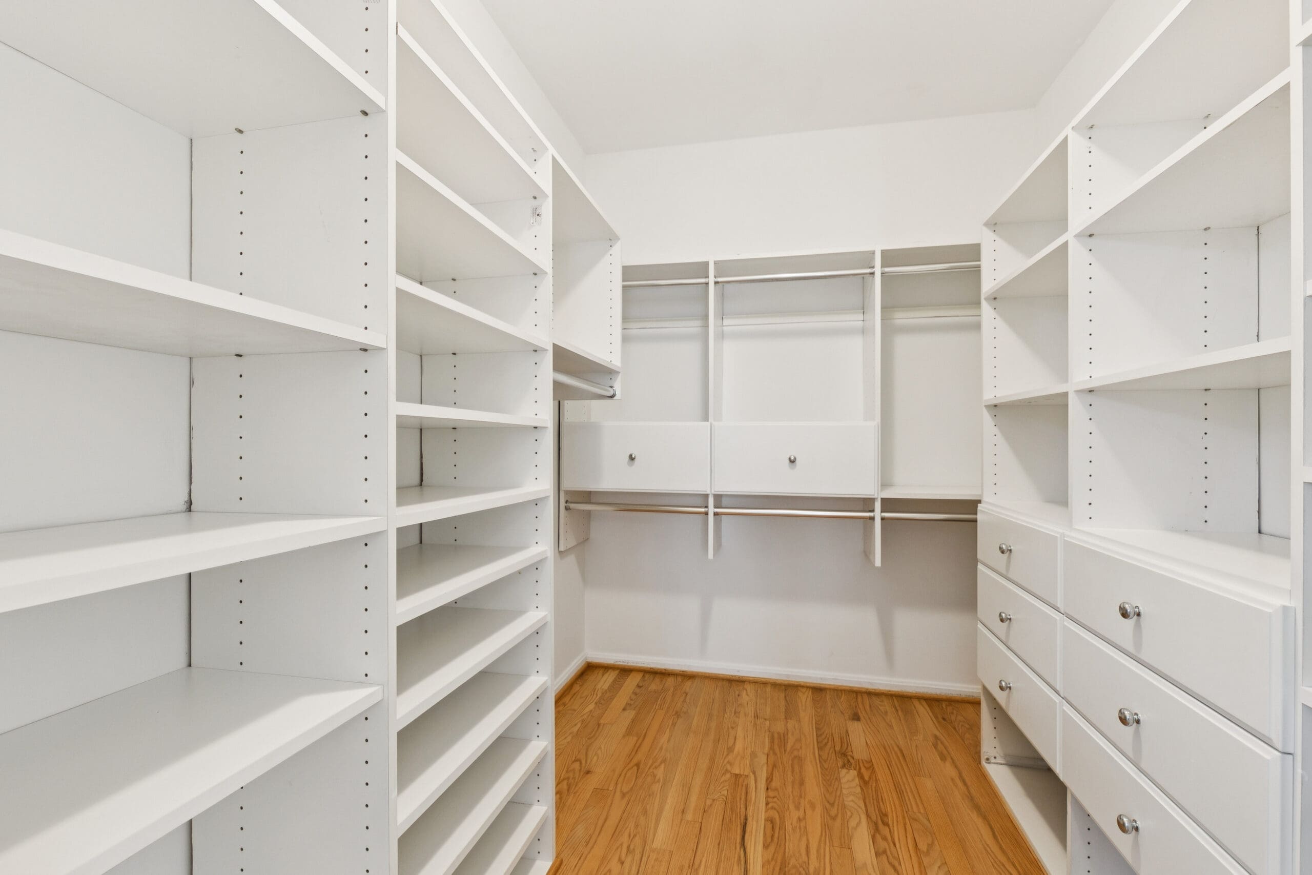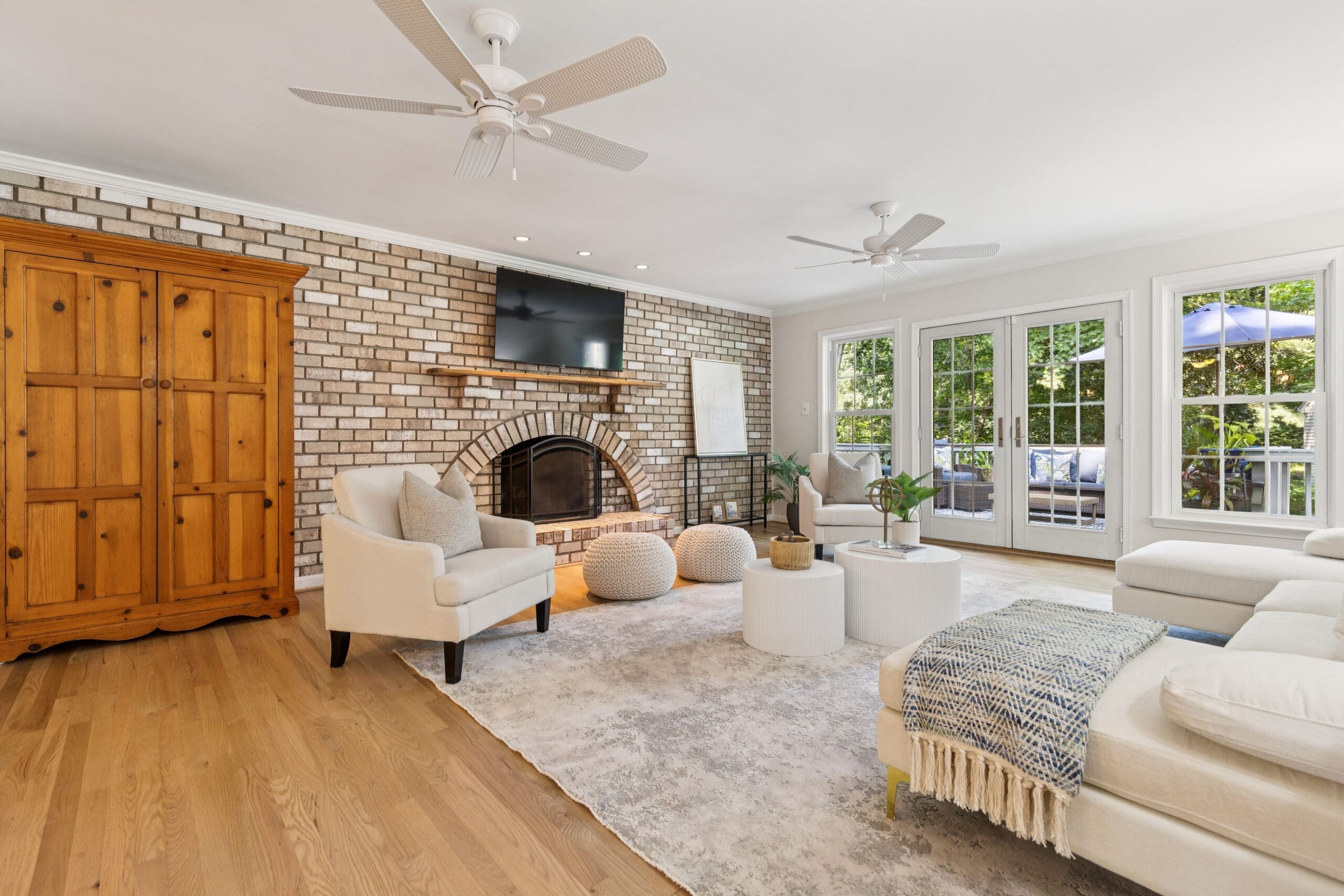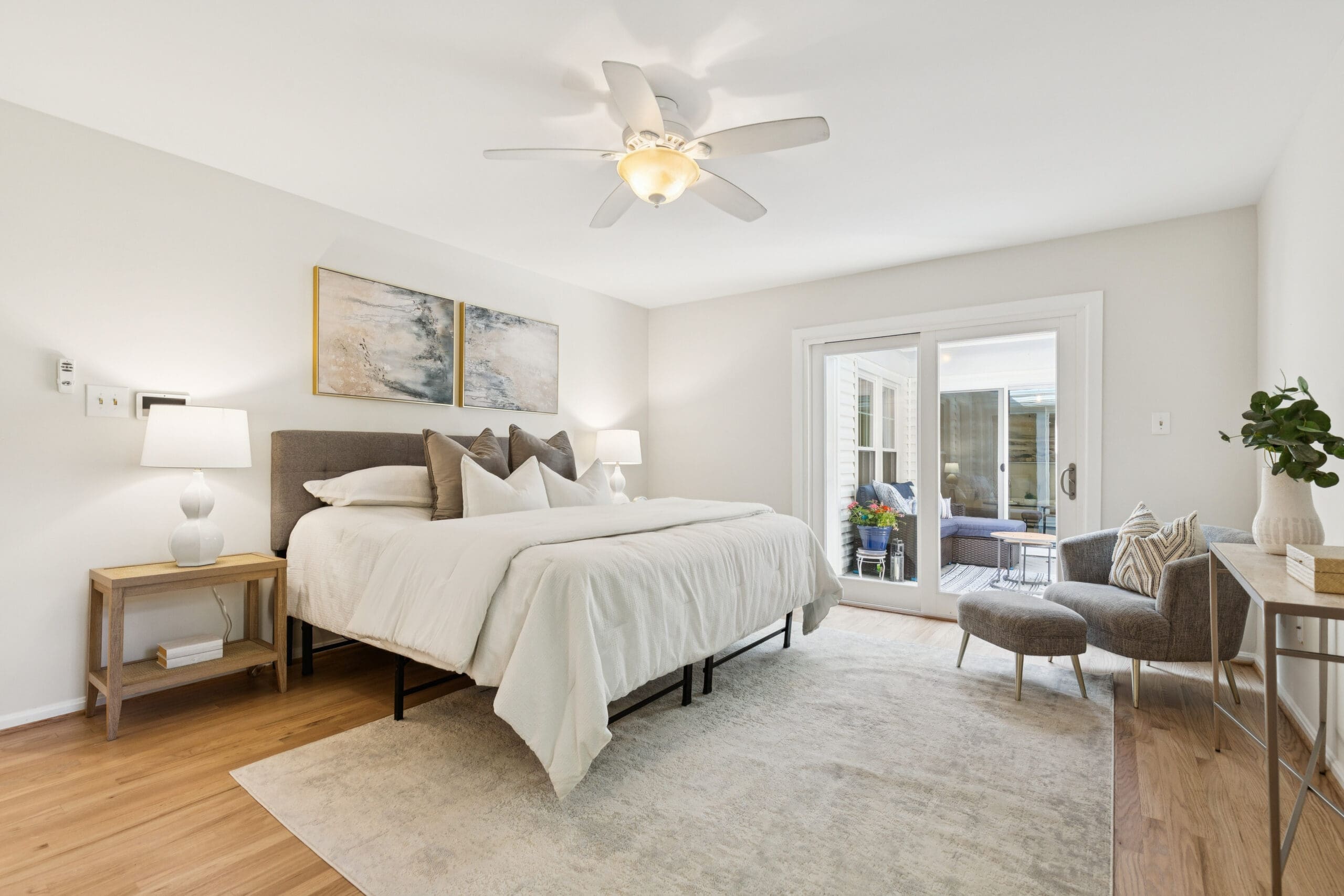 The Primary Suite includes an updated en-suite bath with quartz topped vanity (2025), medicine cabinet (2024), and a walk-in custom closet system. Ceiling fans are installed in all bedrooms and the Family Room. The Powder Room was renovated in 2023.